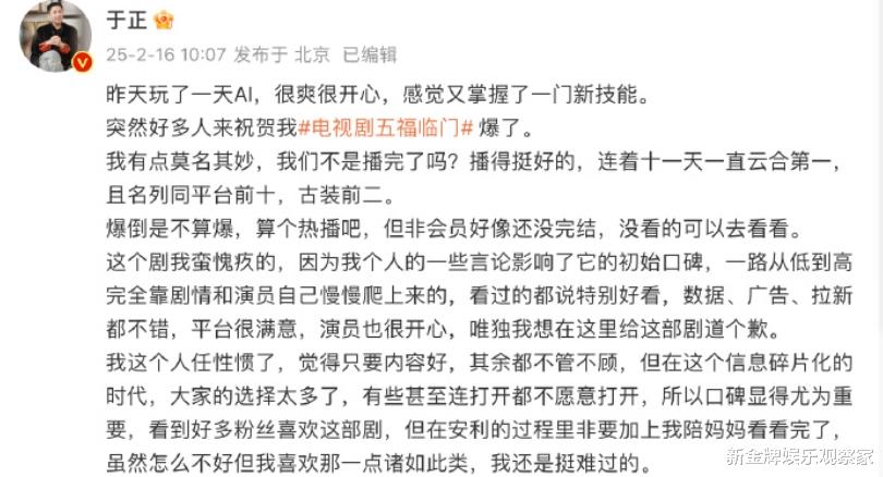 于正近日在社交平台上分享了他对《五福临门》收官成绩的看法。他直言:“爆不算爆,算个热播吧。”对此,他感到有些愧疚,认为自己的言论对剧集的初始口碑产生了影响。他表示想要向这部剧道歉,甚至“磕一个”来表达心意。