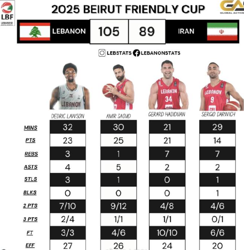 男篮潜在对手黎巴嫩队,贝鲁特杯第二战105-89大胜伊朗,劳森加盟第二战依旧出色,23分3篮板4助攻3抢断。