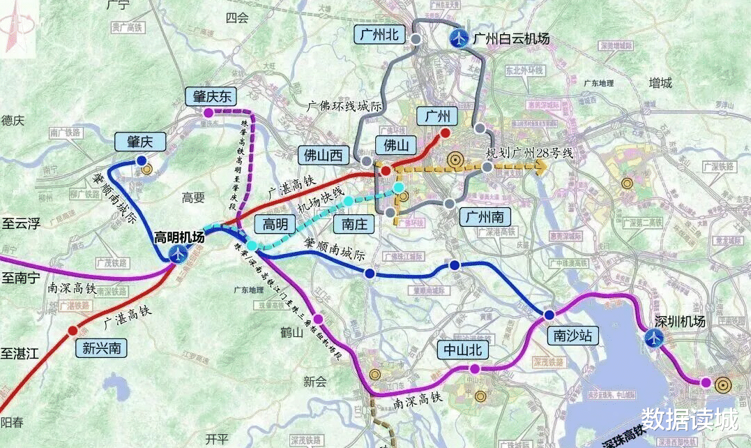 按照建设进展,广湛高铁已于2025年通车,珠肇(南深)高铁计划2026年完成通车并启动联调联试,两条线路在机场站交汇,地下二层站台层由西至东依次排布珠肇高铁、广湛高铁、肇顺南城际、机场快线,形成“两高铁一城际一快线”轨道交通网络。