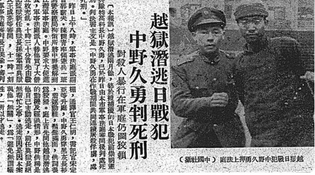 据资料显示,中野久勇并不是江湾监狱的第一个逃跑者,早在他越狱前半年,在押战犯池琦道成、杉山佐五郎就曾越狱逃走,不过都在一周后被抓了回来。