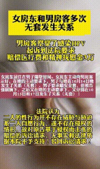 女房东居住在男子隔壁房间,主动向男方示好,在她的主动要求下,男子和女房东两次发生关系,女房东还强制男子不戴套,结果没想到居然感染HPV了,索赔3万被法院驳回——这事儿看得人五味杂陈。 有人说自愿的就得自己扛,也有人觉得“强迫不戴套”算传播疾病。但核心问题在于,亲密关系里的边界和责任从来不是单向的。就算是两情相悦,健康风险也该是双方的共识,强迫对方放弃防护,本身就藏着对他人身体权的漠视。 法院判自愿就得担责,法理上没毛病,但情理上总让人觉得膈应。这提醒我们,比起事后追责,事前守住底线更重要——别让一时的冲动,变成一辈子的健康隐患。 你们觉得,亲密关系里的“强制不防护”,该怎么算?