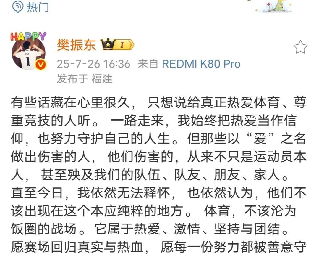 他看霉霉演唱会很好!看东京棒球赛很好!去伯纳乌看足球赛也很好! 我们生来悦己,而非困于他人。 今天,巴黎之前这一年的苦和伤,都从他本人口中亲自得到了证实,被晾晒在阳光下、被看见,这本身也是一种安慰。 能在媒体面前说出这些,也隐约感觉到那段艰难的时光,似乎是熬过去了,愿你未来继续勇敢做自己,愿球迷的爱意可以帮你抚平伤口。 也很感慨,主持人问他: “巴黎奥运会后,你没有参加国际比赛,网络上出现很多声音,说你辜负了国家的培养,前后不到10天的时间里你自己联系了欧洲俱乐部……” 樊振东: “我不想以恶意去揣测,我觉得是大家在并不了解事情全貌的情况下,武断地做出的表达和评论……” 他太善良了,总是把所有的人都想得善良。 可是也有些人,他们就是带着满满的恶意而来,这个恶意是因为你太优秀、太耀眼,你木秀于林触动了背后的利益链。 于是,匹夫无罪,你怀璧其罪。 怎么能不心酸呢? 对所经历的一切好坏不能说照单全收,却也在得知自己无力改变之后,长长地叹口气然后另寻出路,于是你远赴重洋。 作为巴黎周期一路走来的樊振东球迷,我曾觉得巴黎之前你吃了那么多苦,受了那么多罪。 现在好了,你超级全满贯了,巴黎一役十战十胜,赢得那么壮观,那么轰轰烈烈、万人瞩目! 我曾以为,你的舆论环境总该好起来了,你站上冠军领奖台的那一刻,所有的恶意自然而然会闭嘴! 可是并没有,太多时候也难免会失望。 他们尝遍了体育的艰辛,吃尽了我们吃不了的苦,真的不该再承受这些了。 只愿早日迎来清朗的明天,每一份努力都能被善意守护,愿饭圈回到它自己的领地,让真正热爱体育、尊重竞技的人能体验到体育的纯粹美好。 这颗耀眼的沪上明珠,他走过一段最艰难的路,摘下了一颗最亮的星,愿他从此天高海阔,恣意而活。