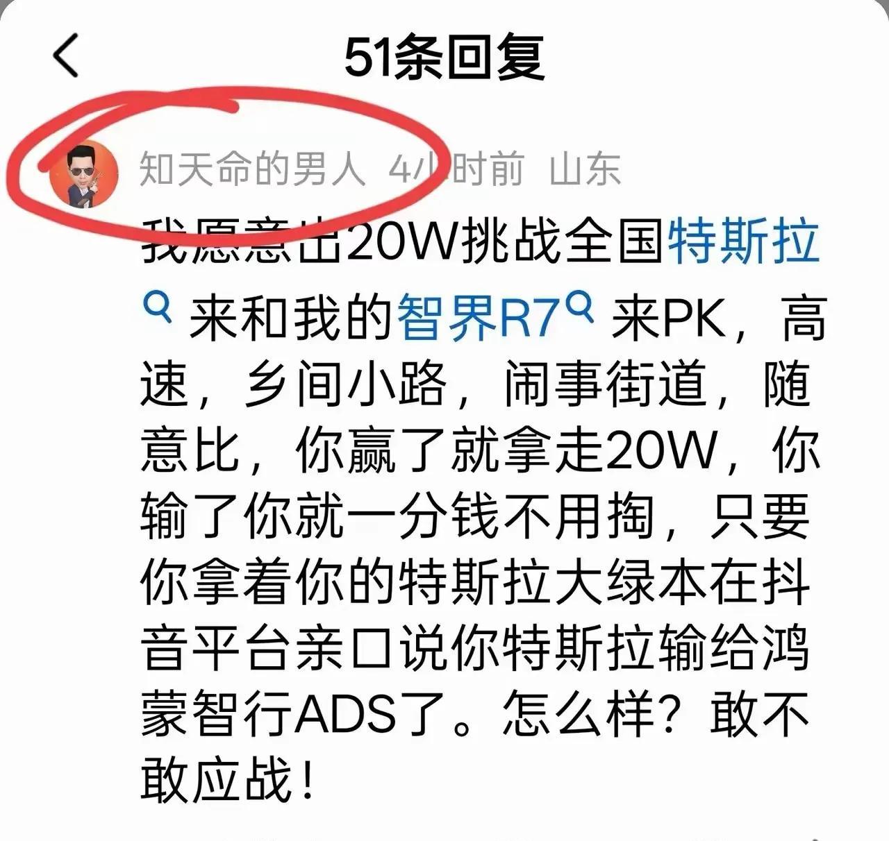 智界r7车主不服懂车帝,向特斯拉车主提出挑战。 近日,特斯拉在懂车帝的高速事故模