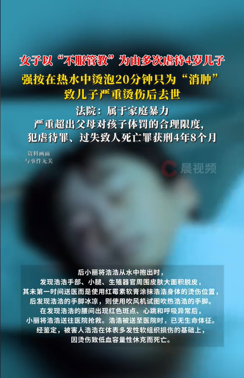 湖北大冶,一女子因4岁儿子不好好吃饭,还随地大小便,气得多次使用打骂式教育,导致儿子的身体大范围淤青。奶奶心疼孙子,拍了伤情照片后告诉了村委,由村委对女子进行了批评教育。可万万没想到,女子竟然用高温热水给儿子洗澡,还不顾儿子反抗将他按在热水中,致其严重烫伤,后经抢救无效死亡。然而法院认定,女子的行为是过失致人死亡。
