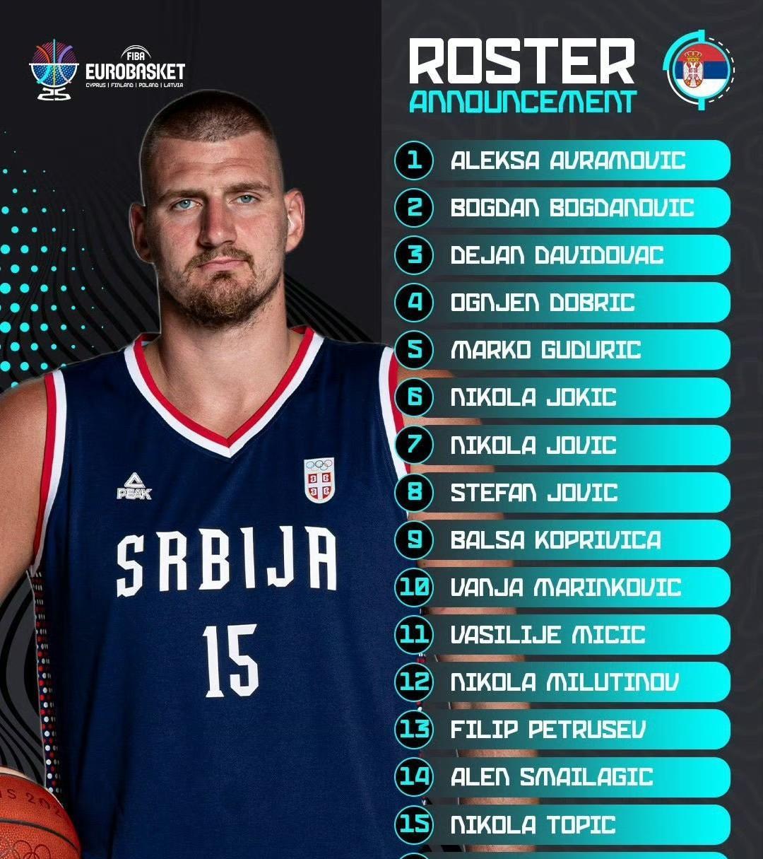 塞尔维亚男篮的欧洲杯名单里有约基奇,另外东契奇、字母、小瓦、申京、马尔卡宁、施罗德、迪文琴佐、阿夫迪亚、索汉等人都计划出战欧洲杯。