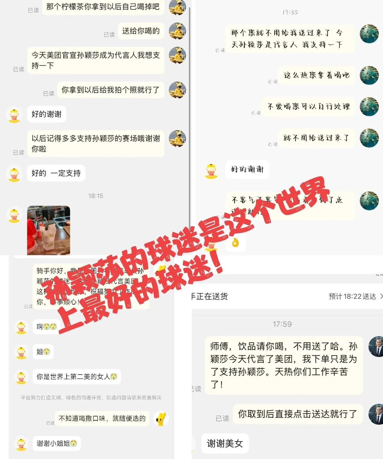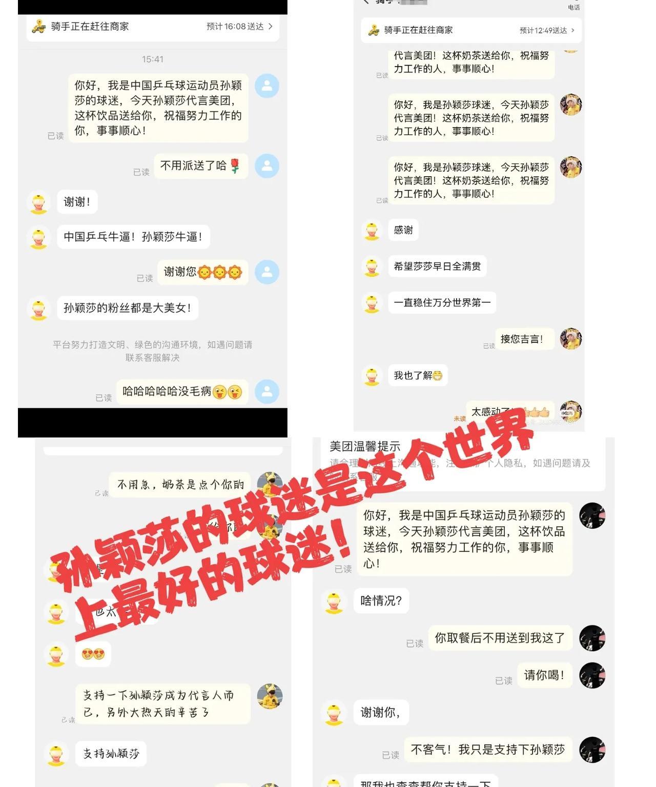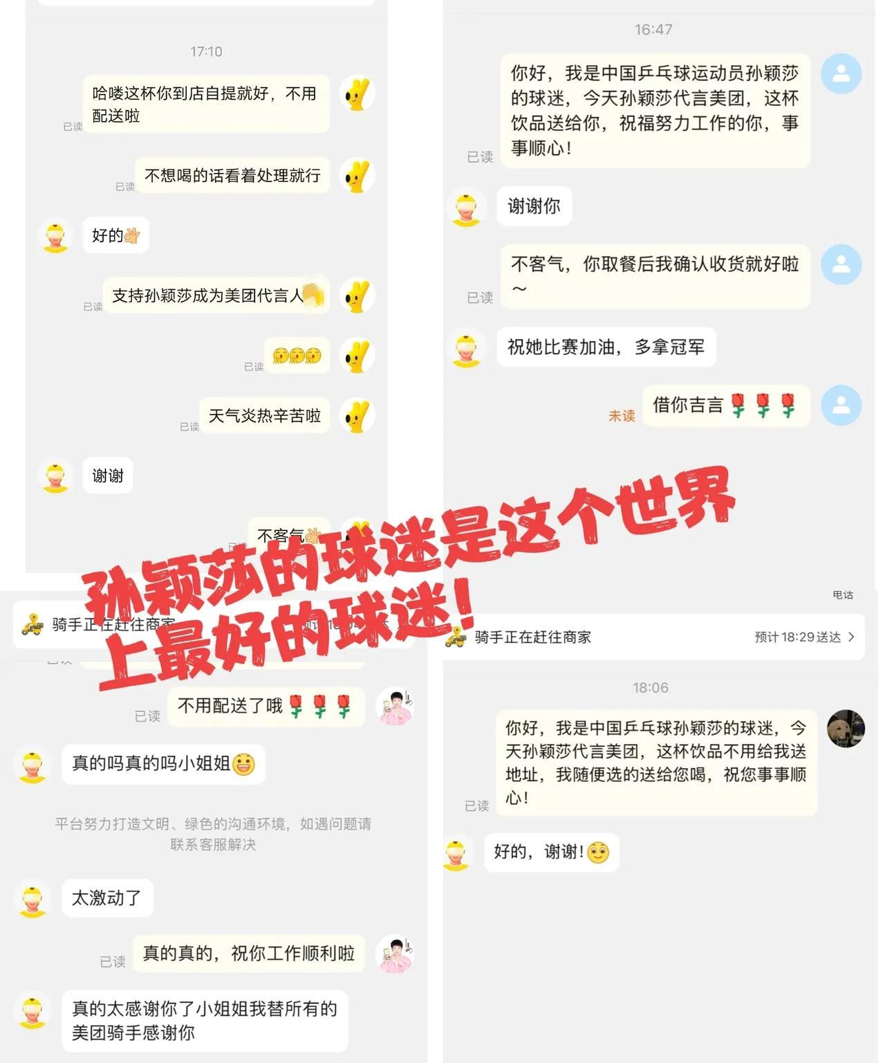 [心][心]就想大声说:莎莎是这个世界上最好的榜样,莎莎的球迷是这个世界上最好的球迷!! 今天中国乡村发展基金会公布了莎莎在做公益赈灾! 同时美团官宣莎莎为代言人的第一天!莎莎的很多球迷也在支持莎莎作为代言人的同时,给在美团工作的辛苦外卖员送上了他们的爱心!这也是另一种形式的公益! 这就是榜样的力量吧!这种爱心,这种积极的,正向的能量,无论放在什么时候,什么阶段,他都永远不会过时! 今天,莎莎的球迷真的又把我狠狠的感动了一把! 喜欢上这么一个正能量的人,还可以这么多善良的人,喜欢上同一个人,是多么的幸福和骄傲的一件事情![赞][赞]