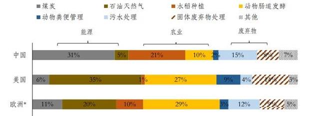 图 5 中、美、欧甲烷排放结构对比(2018年)
