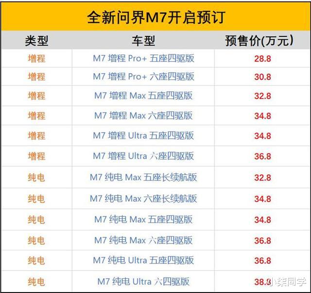 全新问界M7预售期间提供12款配置车型,增程版和纯电版各6款配置车型: