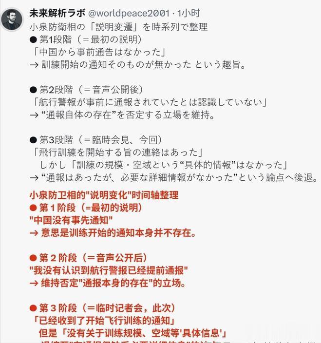 小泉进次郎被证据打脸后,开始改口了。从一开始的"没收到任何信息",变成了"中方事先既没有通报训练时间和地点的经纬度信息"。这就是典型的耍赖皮,眼看一个理由站不住了,赶紧换个说法继续抹黑。小泉进次郎还批评中方"擅自公开录音",言下之意好像通话内容不该让外界知道似的。