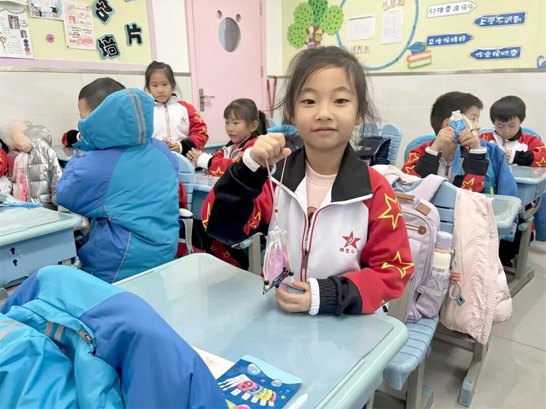 课程高潮当属养生香囊制作环节!中式图案的香囊袋里,装着养生药材——能预防感冒,舒缓情绪。孩子们分组合作,小心翼翼地装药材、系蝴蝶结,在动手实践中感受中医文化的实用性,一个个独一无二的香囊成了最特别的健康礼物。