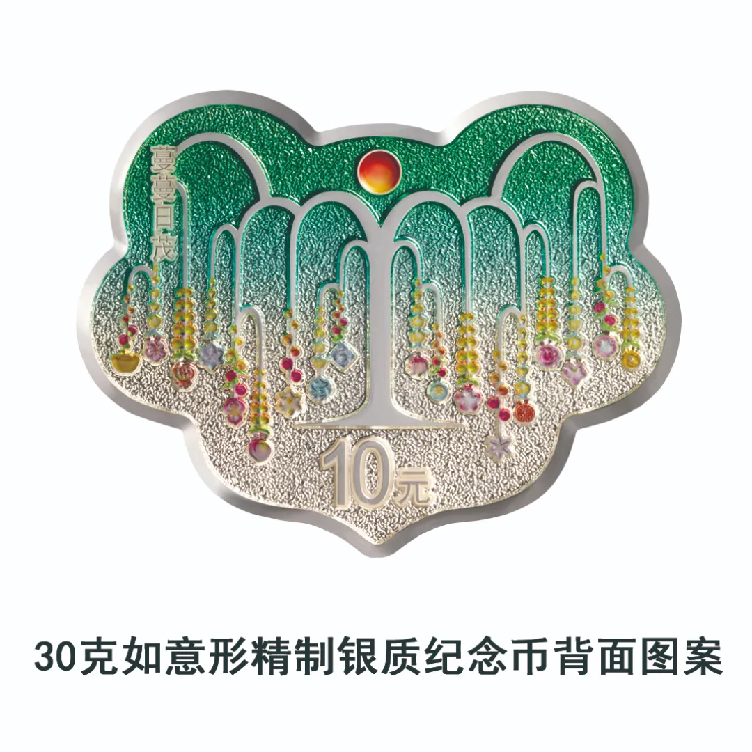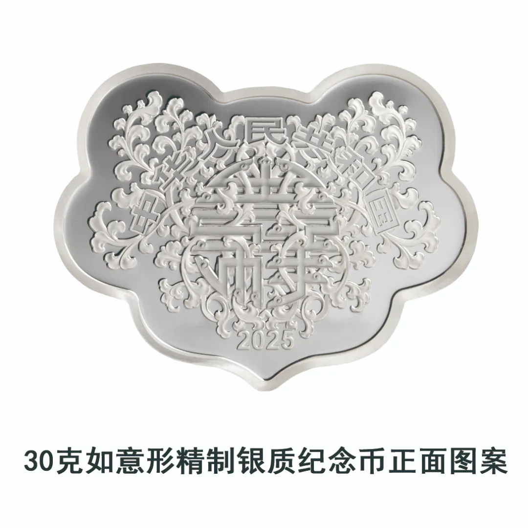 30克如意形银质纪念币为精制币,含纯银30克,外接矩形36毫米×47毫米,面额10元,成色99.9%,最大发行量20000枚。