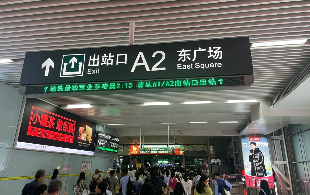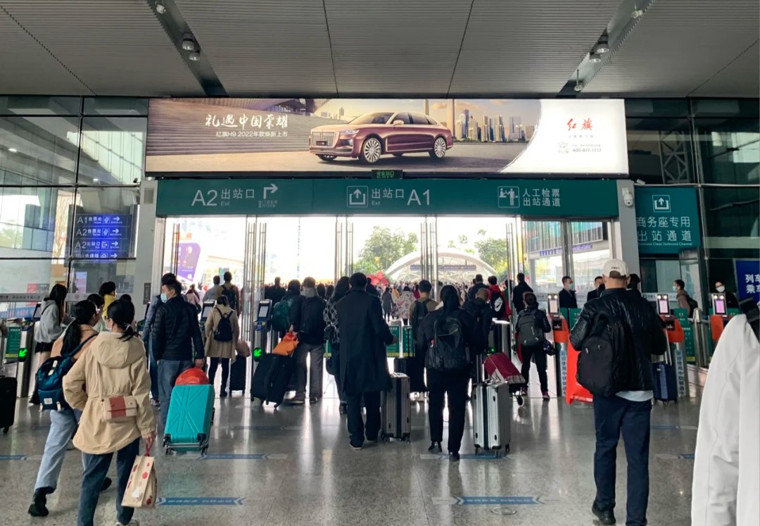2025年深圳北站旅客到发量达1.26亿人次,其到达层出站口是所有抵深旅客的唯一必经通道。上方巨型楣头灯箱(12.01m×1.88m)横跨出口,形成宽阔视觉面,周围无任何遮挡。