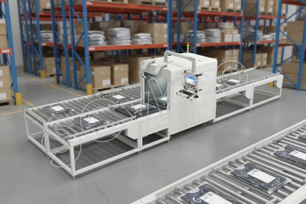 斯科CK-TP2A RFID隧道机在服装仓库环境中展示,柜体稳固,适合SKU密集的服饰企业