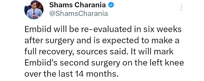 名记Shams透露,恩比德将在手术后六周接受重新评估,预计他能够完全康复。此次接受手术的左膝,正是这位昔日的MVP在2024年2月因外侧半月板受伤而进行过手术的同一部位。