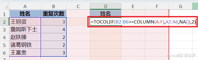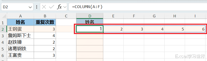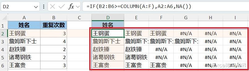 这段公式的作用相当于将 A 列的姓名按指定次数横向重复显示;