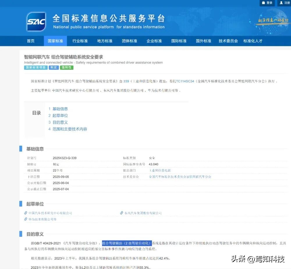 2025 年 6 月 4 日:全国标准信息公共服务平台公示关于征求《智能网联汽车 组合驾驶辅助系统安全要求》拟立项强制性国家标准项目意见的通知,公示日期为 2025 年 6 月 4 日 - 2025 年 7 月 4 日。