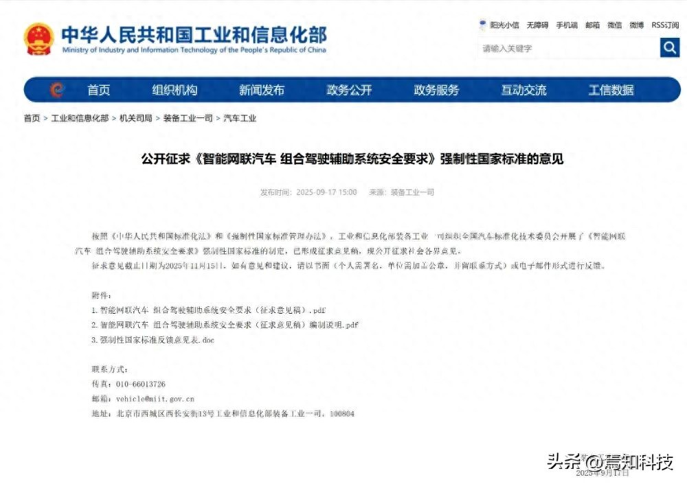 2025 年 9 月 17 日:工业和信息化部就《智能网联汽车 组合驾驶辅助系统安全要求》强制性国家标准公开征求意见,征求意见截止日期为 2025 年 11 月 15 日。