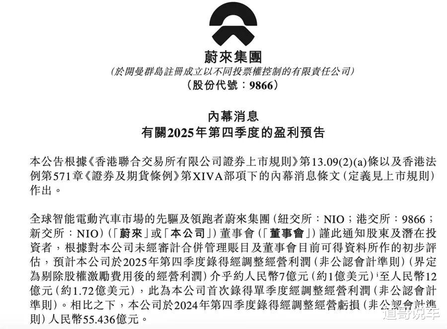 2026年2月5日,蔚来发布公告称,预计公司在2025年第四季度将录得经调整经营利润(非公认会计准则)介于7亿元至12亿元;如果按公认会计准则计量,公司预计在该季度将录得经营利润约2亿元至7亿元。
