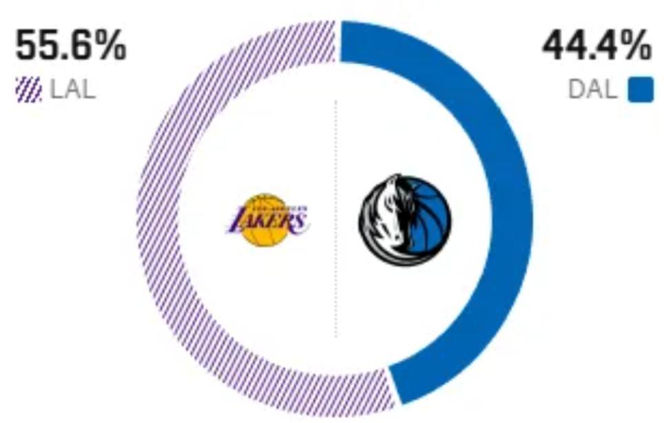 这是两队本赛季的第二次交锋,上一次交手,湖人以10分之差力克独行侠,算是稍占优势。赛前,美媒ESPN对本场比赛进行了胜率预测,湖人队胜率仅有55.6% ,独行侠胜率则为44.4% 。