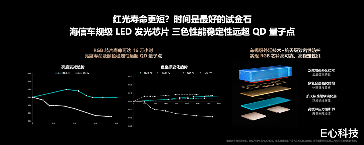 用户日常使用中,采用RGB真彩背光的海信E8S更是带来双重增益:一是节能40%以上,长期使用可显著降低电费支出,更契合绿色家居需求;二是硬件级减少42%有害蓝光,实现护眼不偏色,老人、儿童长时间观看也更安心。稳定性方面,搭载乾照光电全自研车规级发光芯片,经85℃高温、60mA大电流极限测试,红光芯片寿命突破16万小时,超十年不褪色,耐用性远超易老化的量子点方案。
