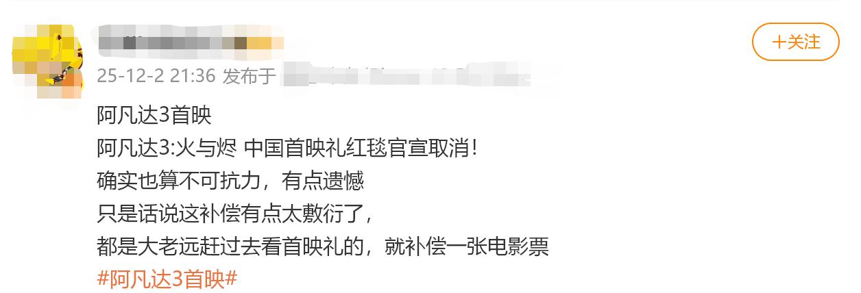 可惜12月1日三亚还在宣传电影首映礼,结果12月2日就传出《阿凡达3》内地首映礼红毯取消的消息,给出的理由也很模糊,声称是因为“不可抗力”。