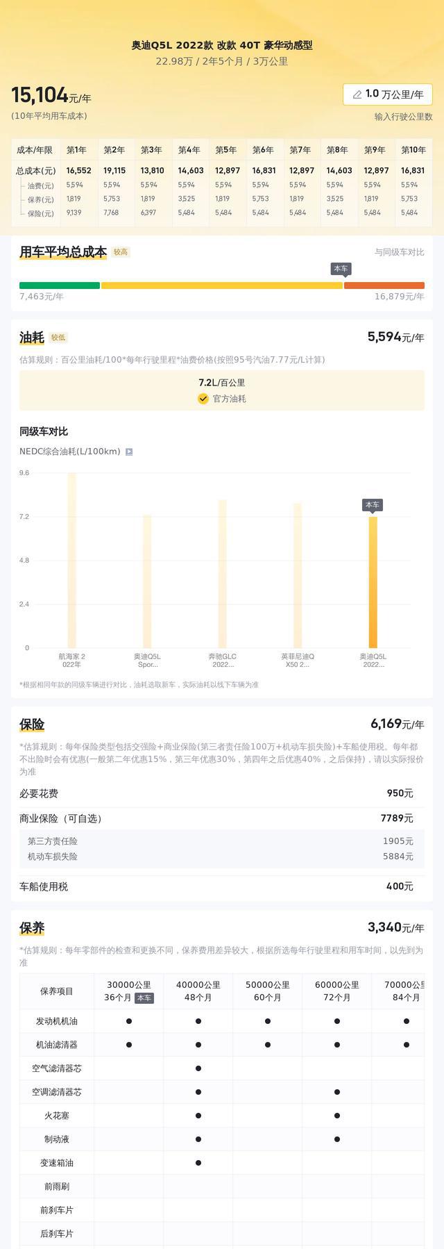 在谈论性能的同时,我们必须提到的还有用车成本。对于一家中高端家庭而言,Oudi Q5L 2022款配置的合理性和经济性显得尤为重要。这款车的综合油耗为7.2L/100km,考虑到其豪华车型的定位,这一油耗表现还是相当不错的。结合10年平均用车成本约15,486元/年来看,面对越来越昂贵的用车成本,奥迪Q5L的性价比在同类车型中依然保持了相对合理的水平。