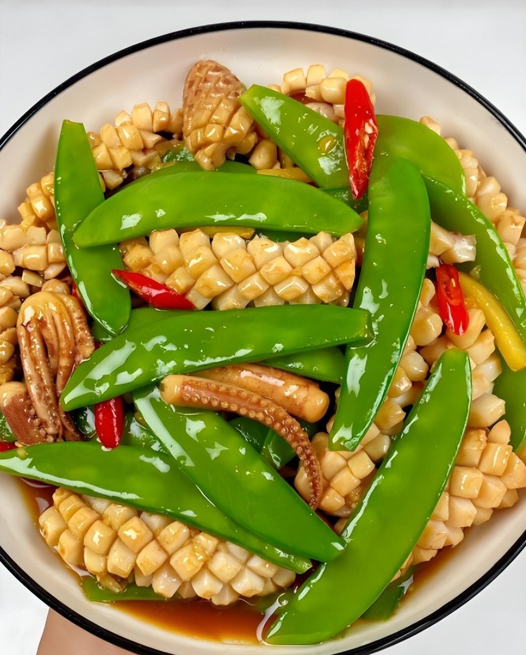 鲜脆爽口的荷兰豆配上嫩滑的鱿鱼,绝对让孩子胃口大开。