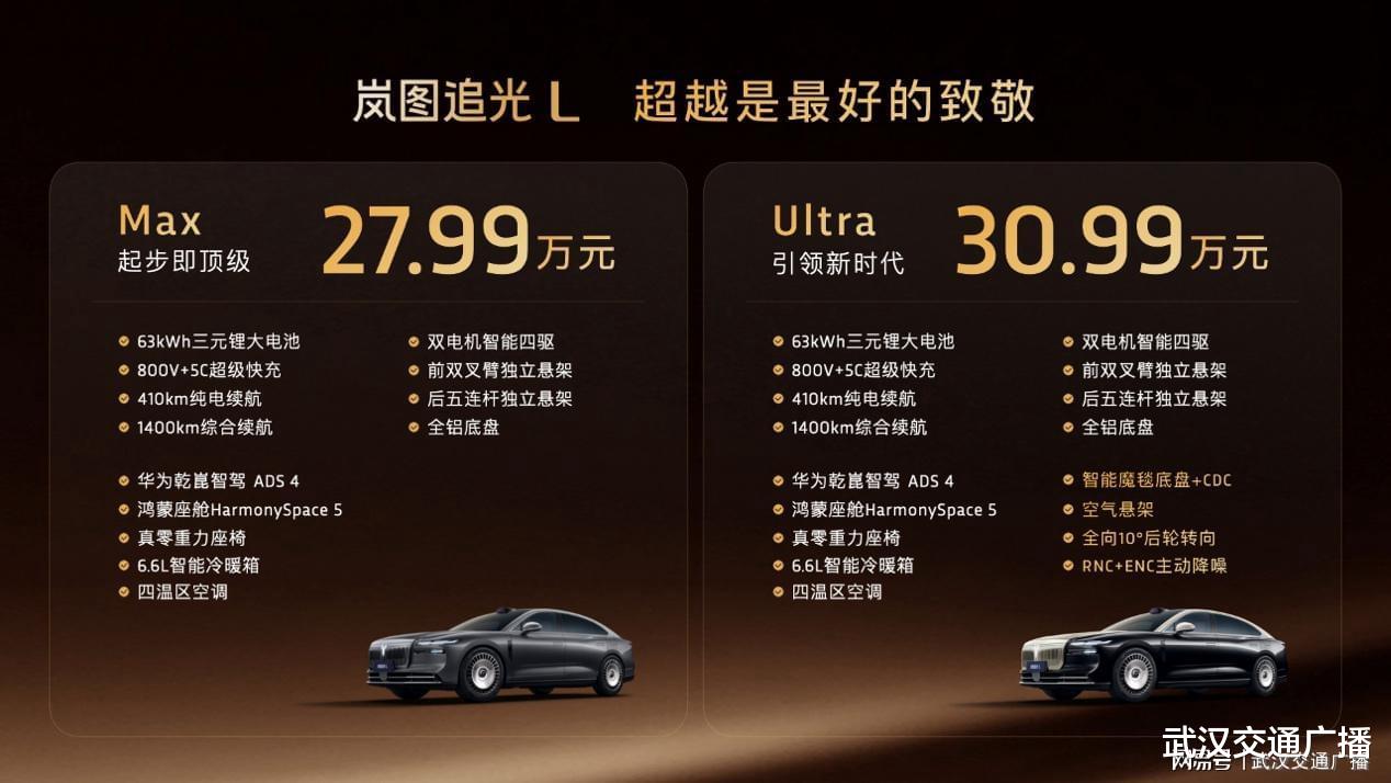 12月10日,新时代旗舰轿车——岚图追光L正式上市,共推出2款版型,售价分别为Max版27.99万元、Ultra版30.99万元。新车同步推出总价值5.2万元的终身免费三电质保、五年免费基础保养等首任车主六大无忧服务权益。