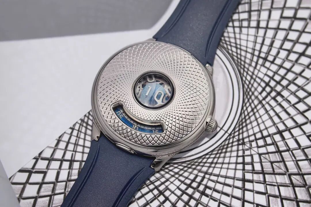 40.5mm 的表壳提供精钢与 18K 金两种选择,最吸睛的是半猎盖上的立体机刻纹,在光线下呈现出宛如黑洞的视觉幻象。表盖中央的放大镜下藏着玄机——一套正在申请专利的 24 小时跳时显示系统,两枚蓝宝石盘与尾随式分钟圈的组合,让读时既前卫又精准。
