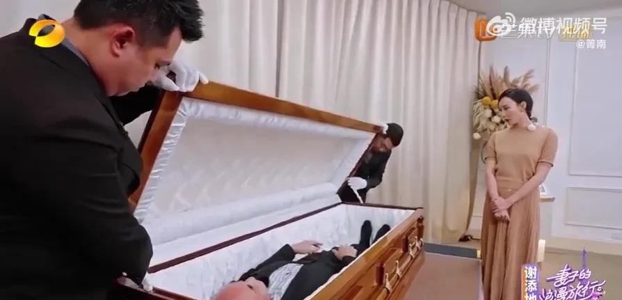 节目中,朱兆祥带胡静参观自己的公司,并为她策划了一场特殊的“葬礼”。