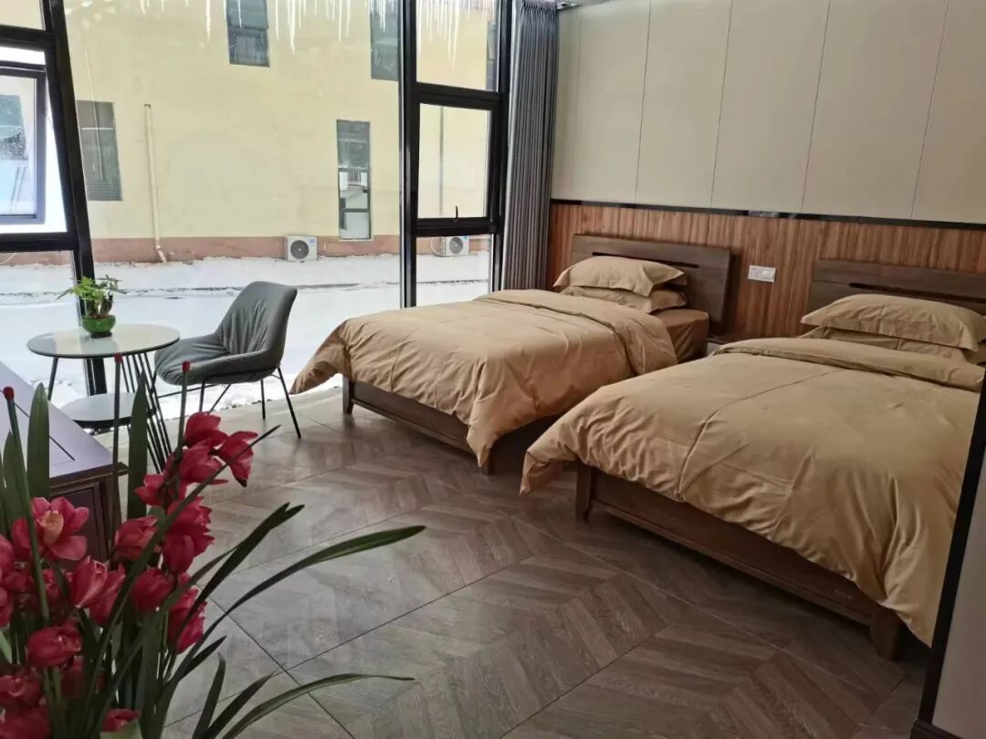 民宿完美延续了川东北传统建筑的风骨,古朴石墙与通透明亮的落地窗巧妙结合,让雪岭晨光成为你私享的流动画卷。在新中式设计的笔触下,整个空间既散发着东方的典雅韵味,又不失现代生活的舒适与高级感。