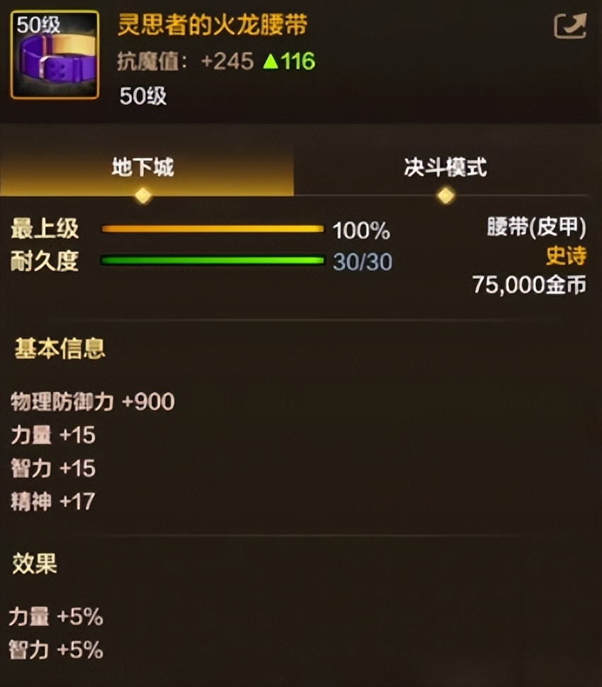 第四个是“灵思者的火龙腰带”,加百分之5的力量和智力,也是物理系和魔法系职业都能用的散搭。
