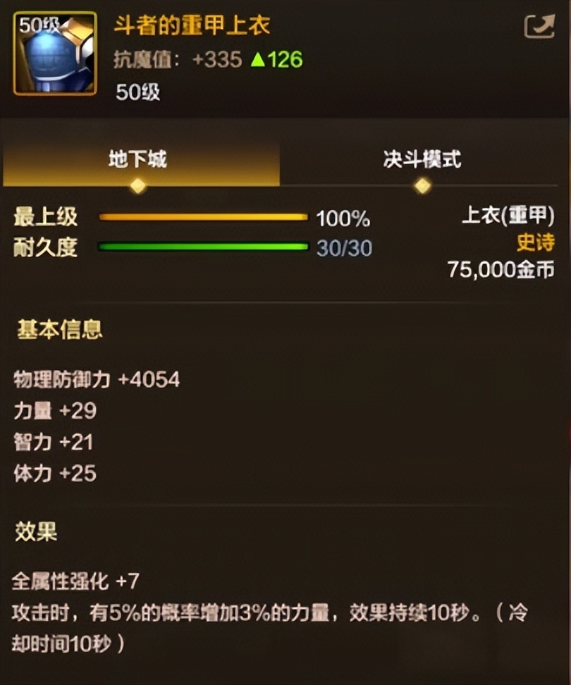 第二个是“斗者的重甲上衣”,主要还是加7点全属性强化,还有额外几率3%力量加成,对伤害有很大提升。