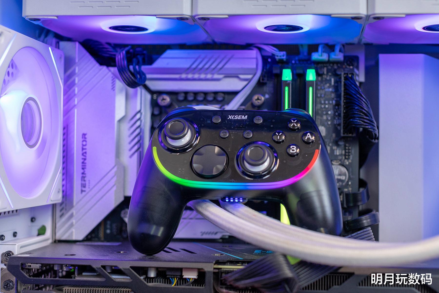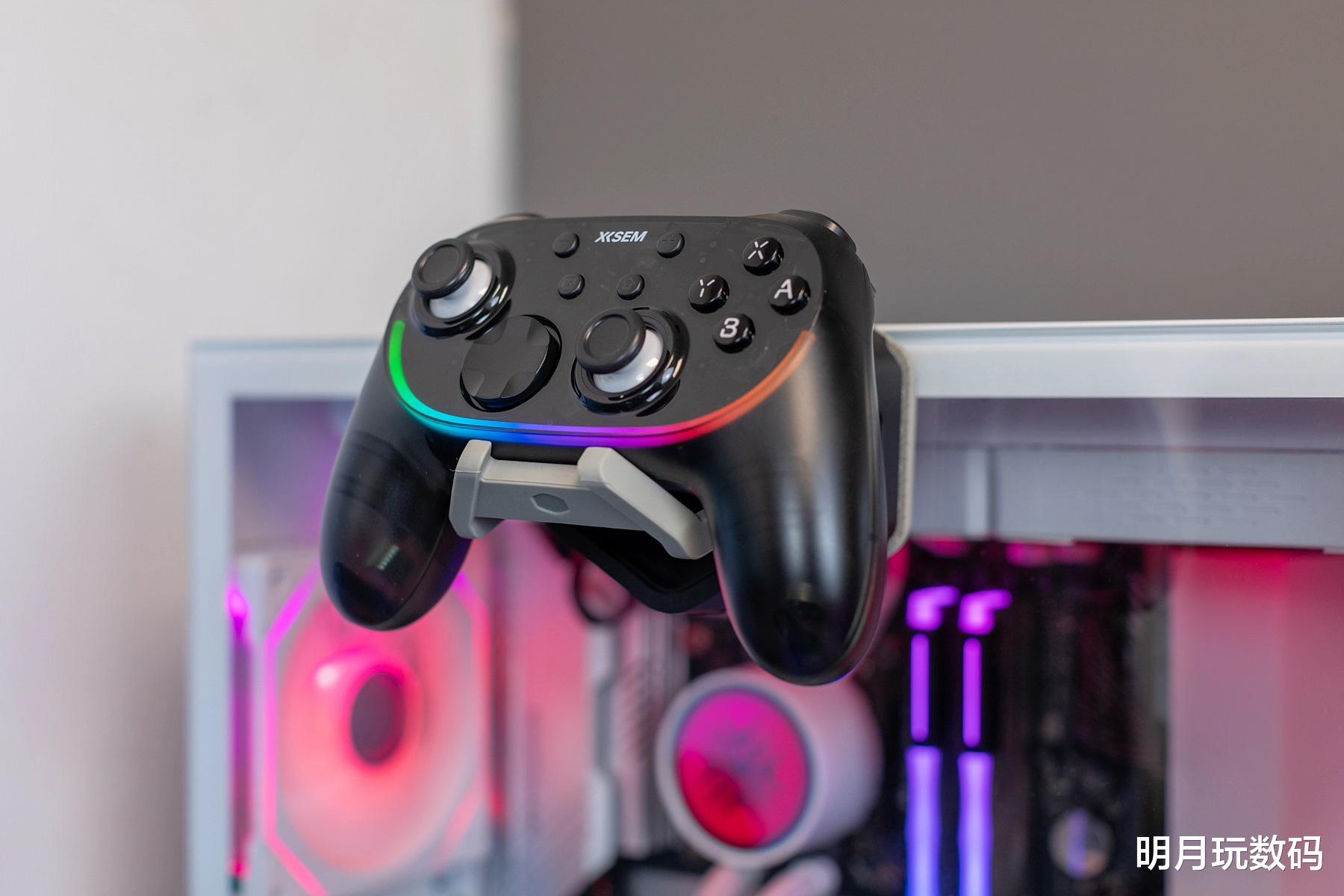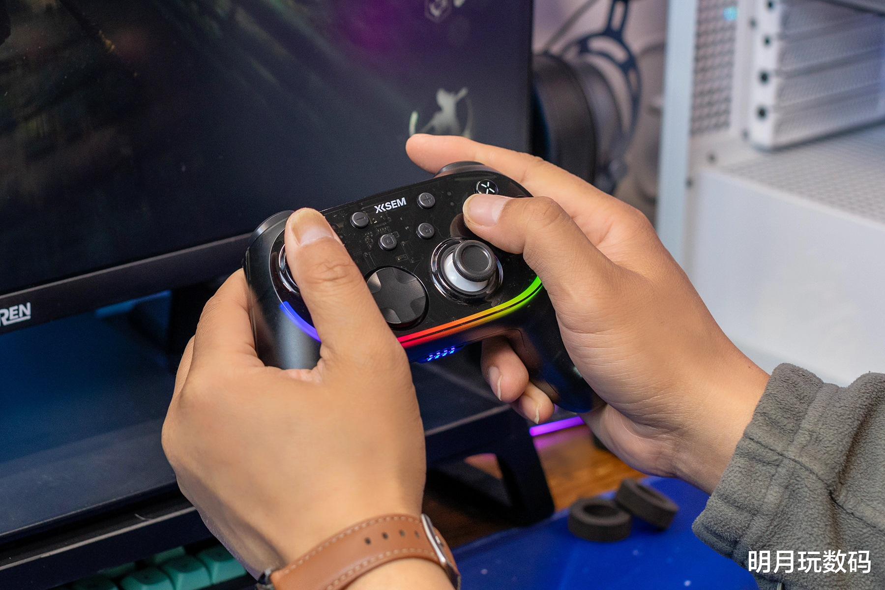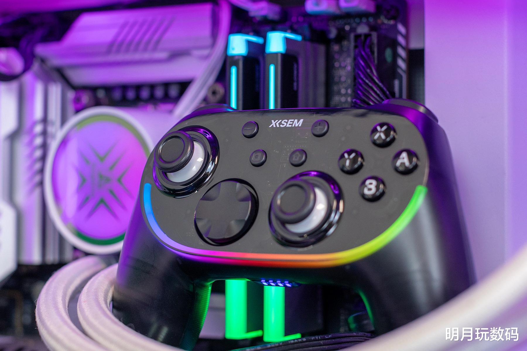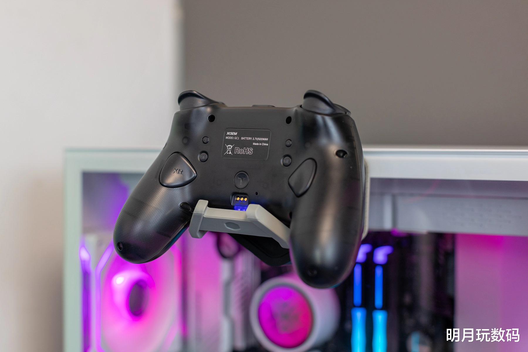 而在手感方面,西圣GC1通过214g的轻量化设计,手柄15°握角的握持感非常舒适,各种按键的操控也相当顺手。同时手柄支持10种RGB光效模式,半环绕于机身的灯光氛围感也是拉满,这也让西圣GC1成了我桌面上又一道风景。另外,手柄背部预留了充电触点,后期应该还有适配的充电底座,希望能够给我们更多惊喜。