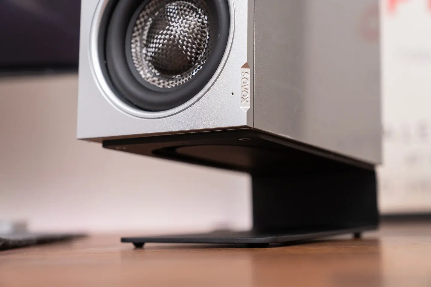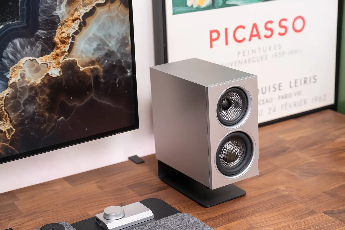 开箱的第一印象是:扎实,且精致。这对音箱的重量远超我对这个体积的预期,单只主箱就超过4公斤。箱体采用一整块6063铝合金,通过CNC加工和阳极氧化表面处理工艺一体成型。拿在手里,那种冰凉、致密且毫无谐振的质感,瞬间就与普通的木箱或塑料箱拉开了差距。这种金属箱体因为厚实坚固,因此不仅能有效抑制共振,让声音更干净,极简精致的外观也能让它成为一件不错的桌搭单品。