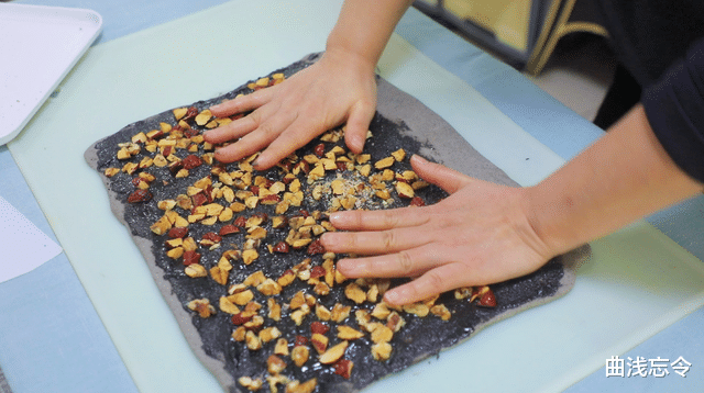6.核桃红枣等颗粒按压一下,使其更好的陷入面团,避免容易脱落。