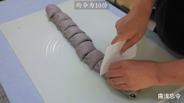 7、分切:将卷起来的面团搓成合适的长度,再均分切成10份。