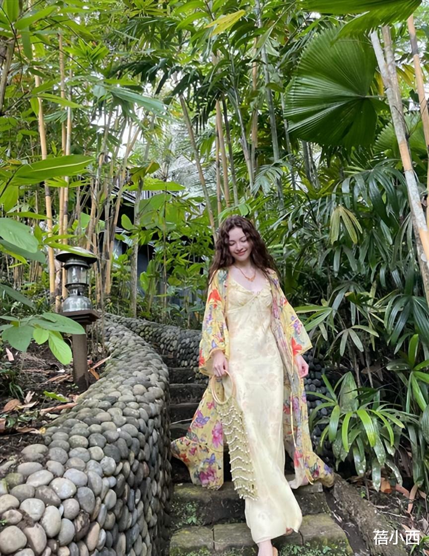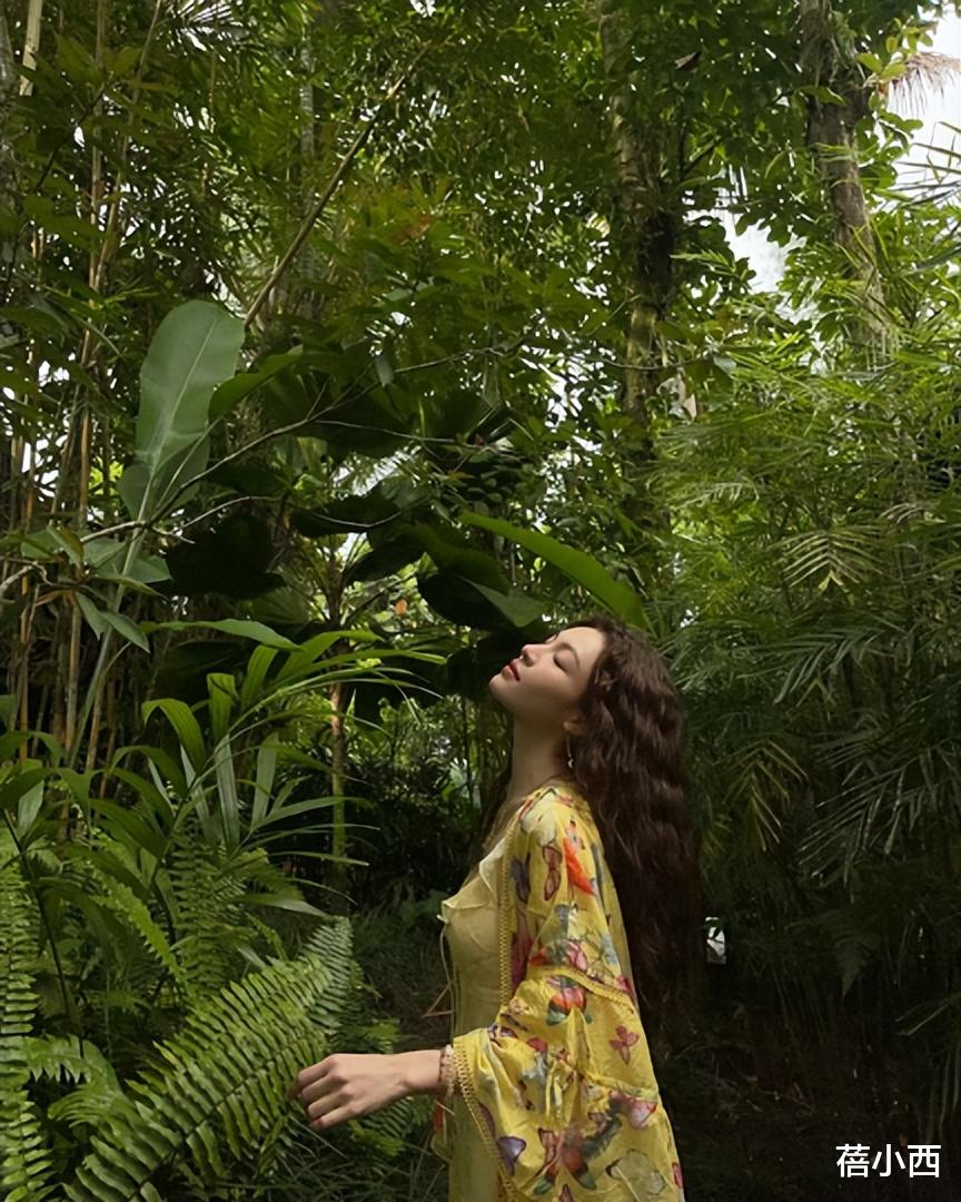 黄色虽然不是一个显白的颜色,可钟楚曦身上这条淡淡的黄色吊带连衣裙却很有小家碧玉的味道,裙子整体的设计还是比较大胆的,上半身的露肤度会比较高,对于身材偏瘦的女孩子来说会更友好,如果觉得单穿这条吊带裙太性感的话,也可以像钟楚曦一样搭配一件同色系的开衫。