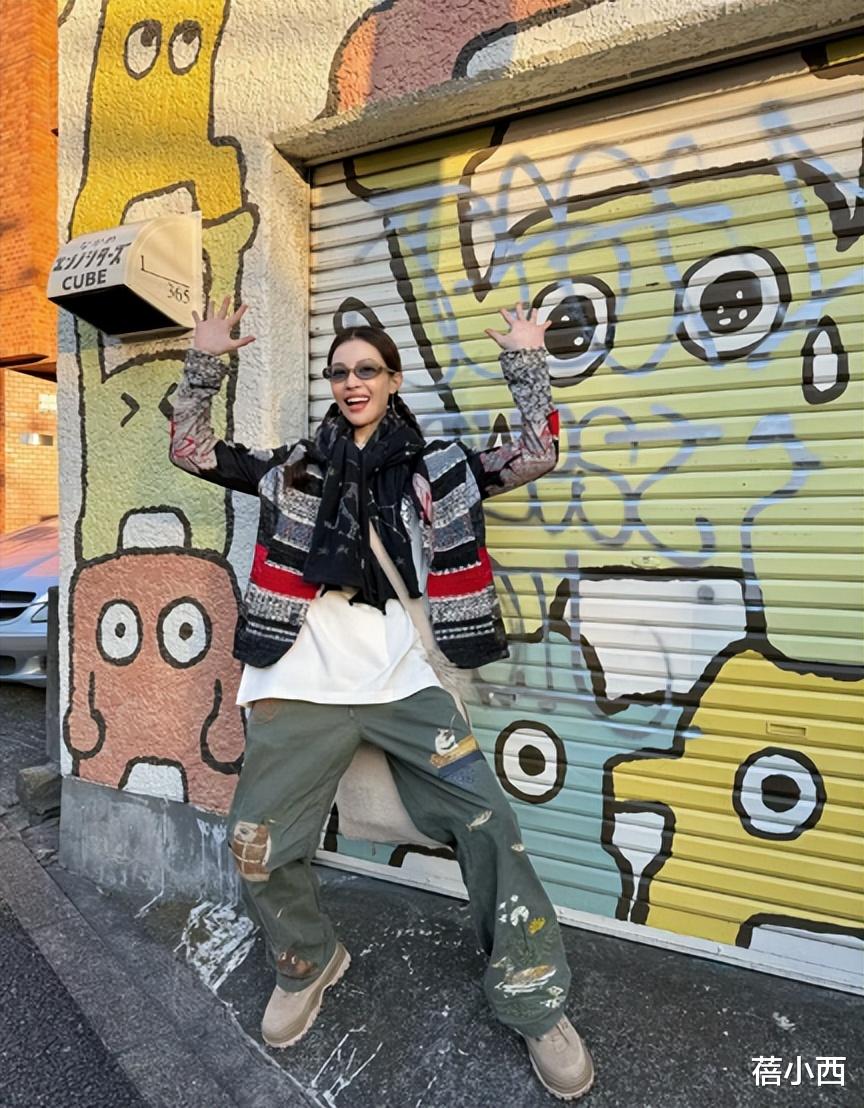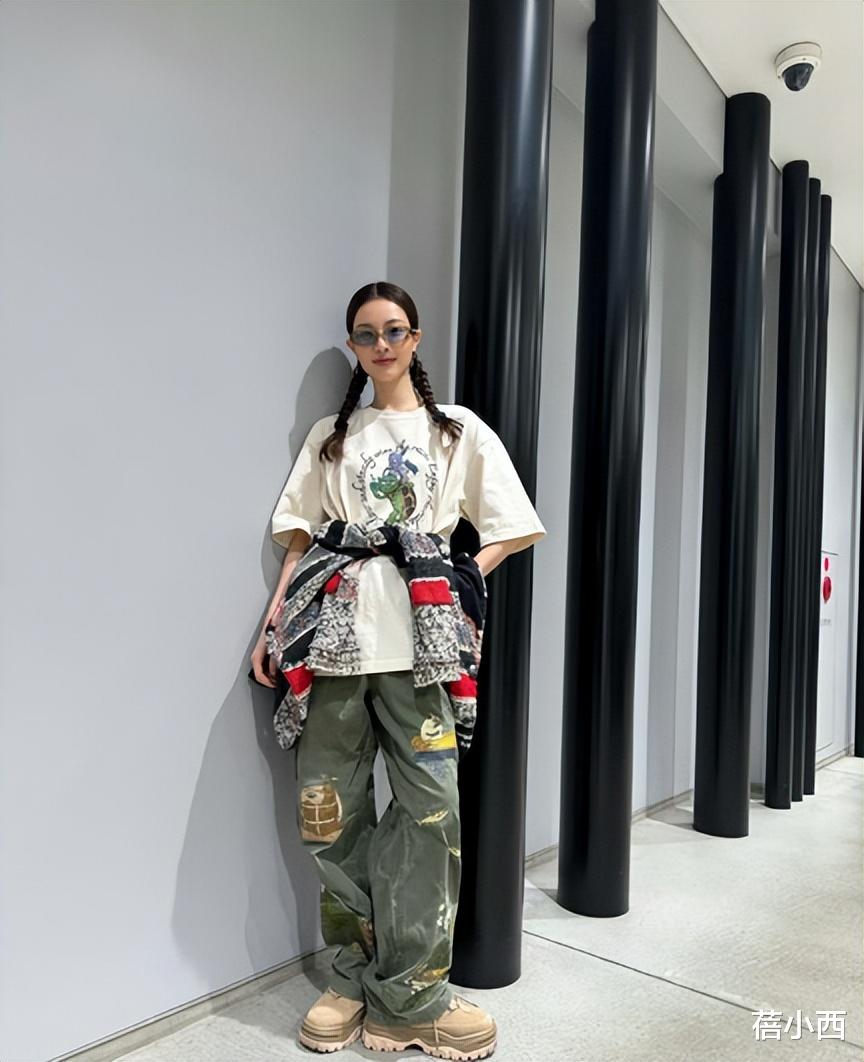 钟楚曦搭配的卡通牛仔裤整体会比较宽松点,松松垮垮的倒是带着几分美式街头的感觉,而且牛仔裤的颜色也是故意做旧的设计,瞬间就好像来到了加州一样。