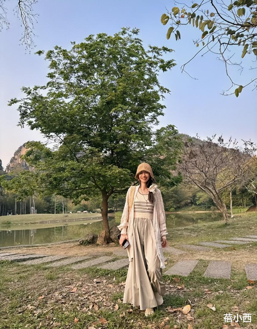 这套造型在细节处的搭配也很不错,休闲的渔夫帽加上白色的头花,让这套造型多了几分纯欲的感觉,一整套风格就是很典型的森系田园风。脚上再搭配一双凉鞋,那这套出游的造型就很完美了。