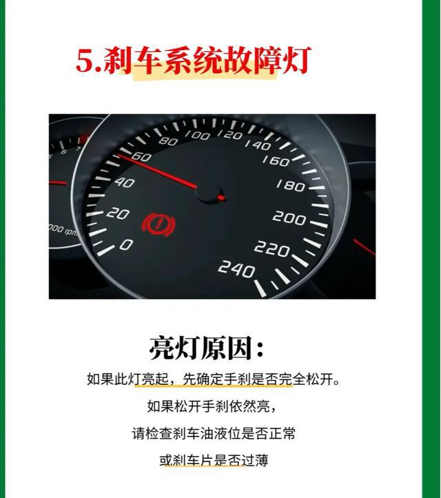 再来看刹车系统警告灯,这一信号灯以一个带叹号的红色圆圈形式呈现。如果在行车途中,突然发现这个灯亮起,且刹车变得软绵无力,那么很有可能你会遭遇刹车失效的危险。这种危险在下坡时尤为明显。面对刹车灯应亮起的情况,合理的措施是反复踩踏刹车,尝试建立油压,并降低车速。而一些车主却错误地猛拉手刹,导致车辆失控。根据安全委员会的调查,刹车失效引发的交通事故占整体事故的20%左右,许多事故均是因为未能正确处理刹车系统警告灯的情况而发生的。