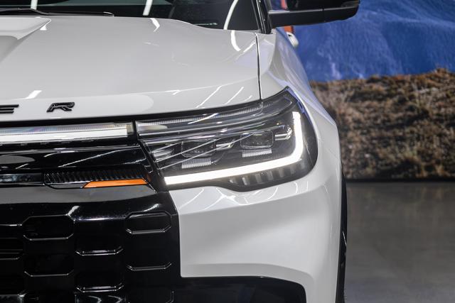 格栅两侧有狭长的发光灯带,连接左右大灯充当日间行车灯,辨识度很高,白天行驶时也能让其他车辆快速识别。格栅下方两侧有犀利的导流槽,搭配梯形进气口,进气口上方配备可主动闭合的横向镀铬饰条,能优化空气动力学表现,降低车辆行驶时的风阻,同时也能辅助提升燃油经济性。