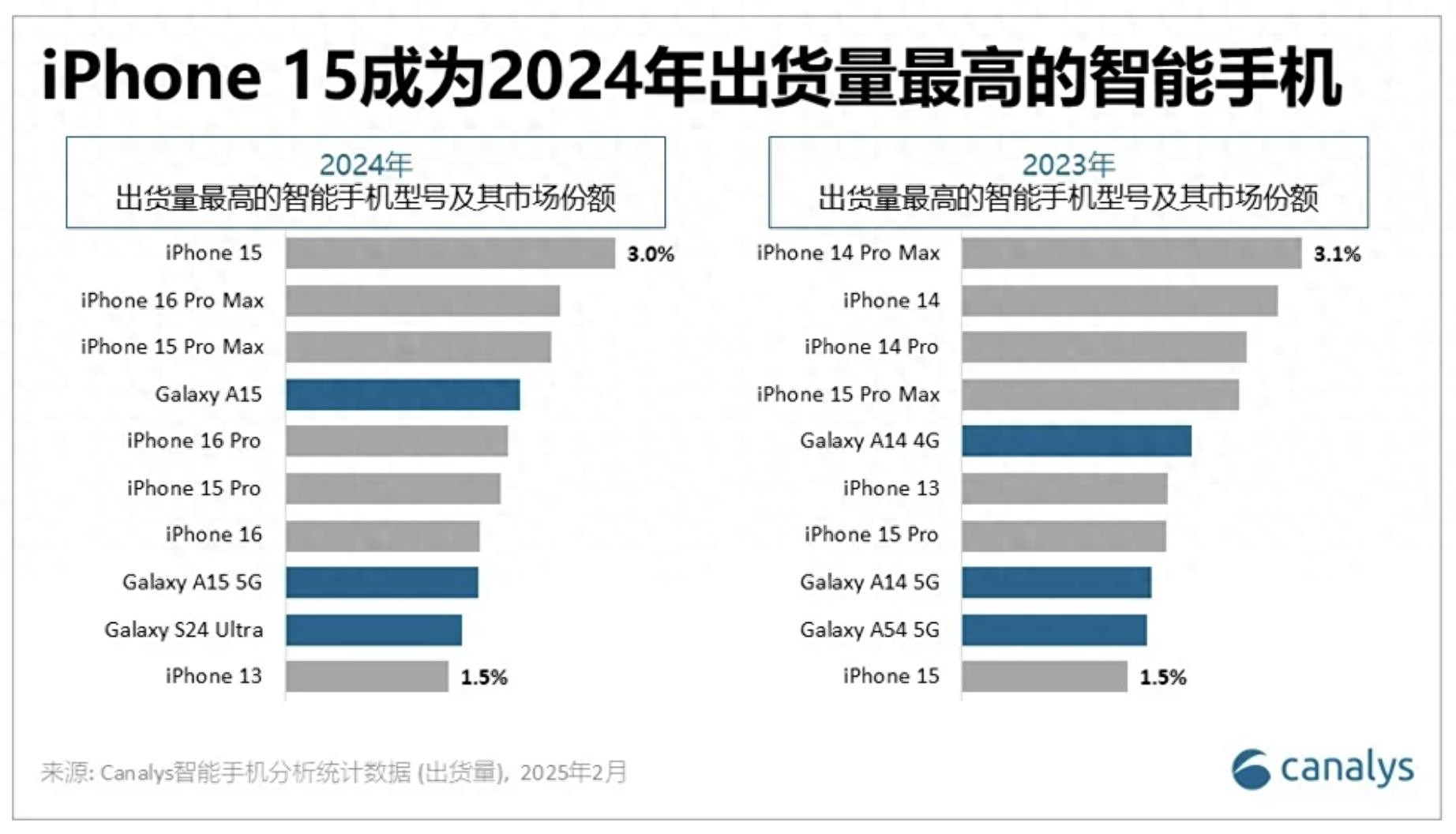 日前,知名市场分析机构Canalys发布了一组最新的市场报告。数据显示,在全球畅销手机Top10榜单中,苹果共七款iPhone上榜,包含全球销量第一的单品机型iPhone 15,由此可见,苹果在2024年全球智能手机市场显然是处于强势霸榜、一骑绝尘的领先地位。除此之外,紧随其后的三星,一共有Galaxy A15、Galaxy A15 5G、Galaxy S24 Ultra三款机型上榜。相较于苹果、三星,一个残酷的现实:全球畅销手机Top10,国产手机无一上榜。