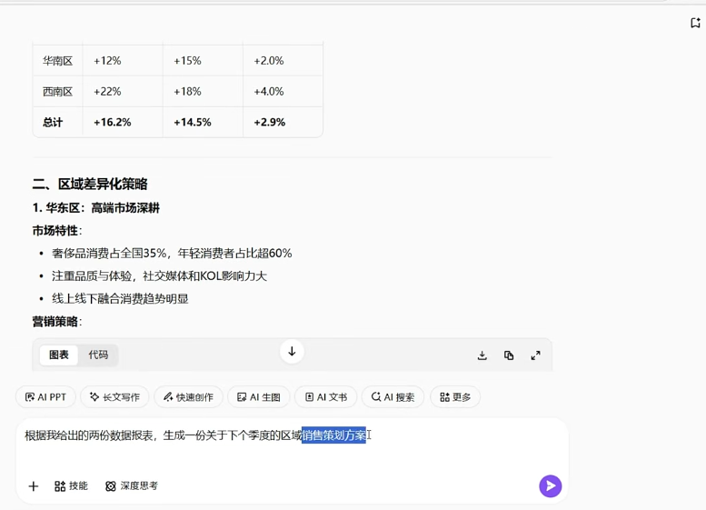 例如我让AI根据刚才那份区域销售数据,生成一份区域销售策划方案。AI会先自动识别表格中的关键指标,包括营收、利润率、区域占比等数据,然后对这些信息进行整理,自动搭建出一个完整的方案框架,比如销售现状分析、区域表现对比、问题诊断以及策略建议等部分。