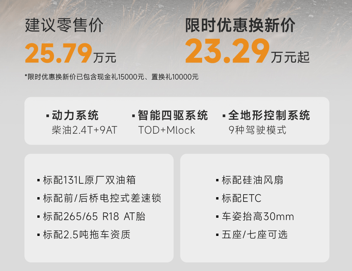 2025年12月11日, 哈弗H9穿越版正式上市。官方指导价为25.79万元,优惠换新价23.29万元起。作为新版本车型,其整体造型与现款保持一致,仅针对配置进行升级。原厂标准配置三把差速锁和博格华纳TOD四驱系统,支持9种不同的驾驶模式,并配备了131L的双油箱,从而实现了1400km的超长续航能力。同时可提供5座和7座可选。