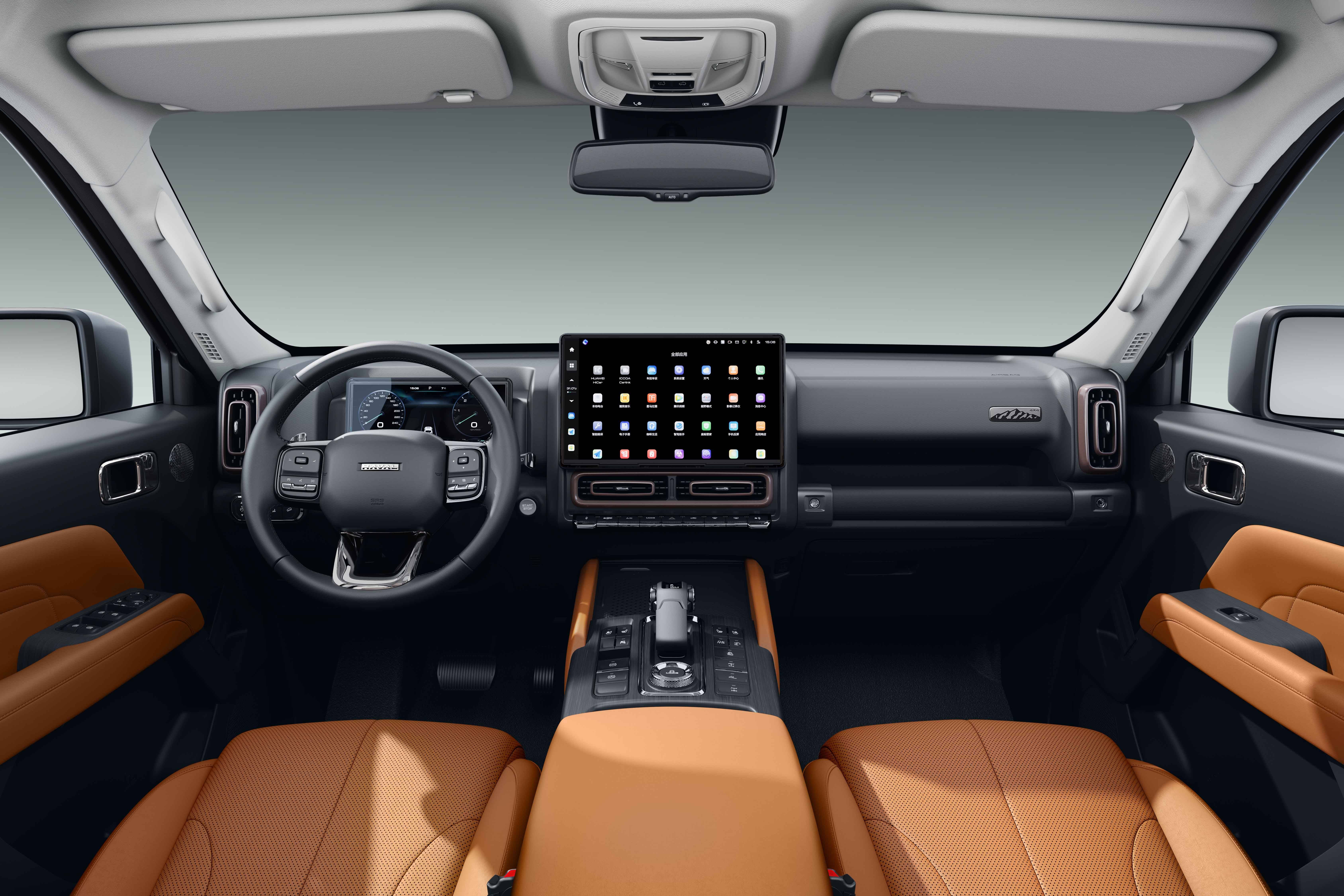 内饰方面,延续了现款车型的设计风格,提供纯黑和棕色+黑色的搭配方案。整体采用较为平直的中控台线条,并在多处细节加入镀铬元素进行点缀,搭配三辐式多功能方向盘、14.6英寸中控屏以及造型别致的换挡挡杆,同时,其还将配备座椅加热/通风以及坦克掉头等功能。