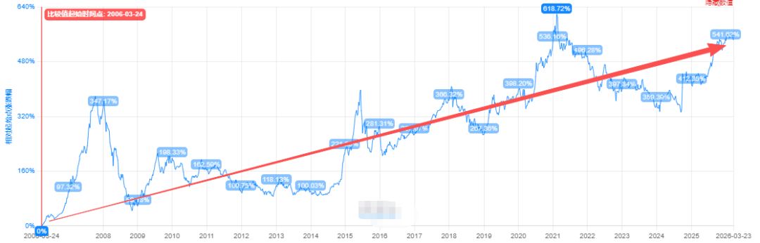 而只要不出现永久性损失的风险,你的长期收益会是下图这样的。这是A股成立时间最早的大盘宽基指数基金。红色箭头就是你的长期收益,过去20年的收益率是541%,翻了6倍多。