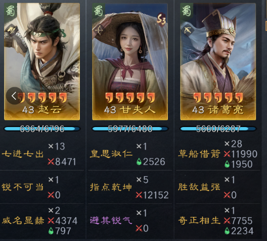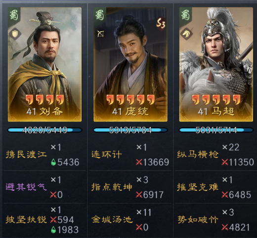 第三队是马超庞统队(萁形阵),刘备带避其锐气+披坚执锐(智力+队友增伤/自身减伤/缴械/抵御韬略),庞统带指点乾坤+金城汤池(智力金书+增伤韬略),马超带摧坚克难+势如破竹(高速+武力金书+会心韬略),特点是爆发高,1 - 2回合就能秒敌。