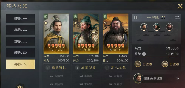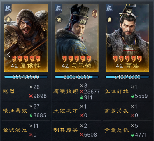 四阶段(35级 - 开战级):苦肉弓开9级地不太稳定,战损难控制,作战能力一般。这里推荐几个初期作战阵容。第一队是双减司马懿(萁形阵),夏侯惇带横征暴敛+金城汤池(统率金书+减伤韬略),司马懿带王佐之才/胜敌益强+明其虚实(金书+主动增伤+增伤韬略),曹操带蓄势待发+青囊急救(谋略增伤金书+缴械+俩人抵御),特点是坦度极高,司马懿自保能力强。