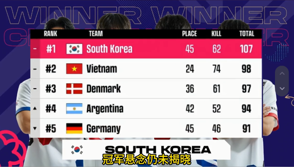目前随着赛程的进行,此次PNC全明星赛的第二个比赛日已经结束,期间在第一个比赛日垫底的土耳其队中场两连鸡成功冲到前十,依靠着超强正面能力的越南队两天则是砍下了74个淘汰,目前已致积分榜第二,淘汰榜第一,而相比之下,阿根廷队与巴西队则是有了十分明显的疲惫,韩国队则是在DNW三核的带领下成为了当天唯一一支积分破百的队伍,只不过由于前五名的积分差距并不是十分明显,因此冠军依旧有着不小的悬念。